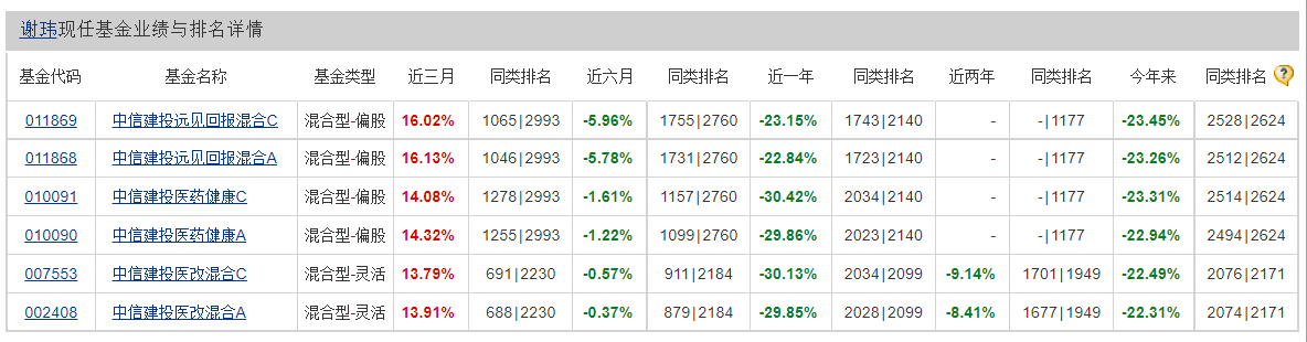 据天天基金网数据,谢玮管理的6只基金中,任职期均超过1年,任职期内亏损的有4只基金,其中,中信建投远见回报混合A、中信建投远见回报混合C自2021年8月10日任职以来,恰好一年,回报率分别为-22.00%、-22.31%;中信建投医药健康A、中信建投医药健康C任职1年又320天,任期内回报率分别为-11.36%、-12.68%。