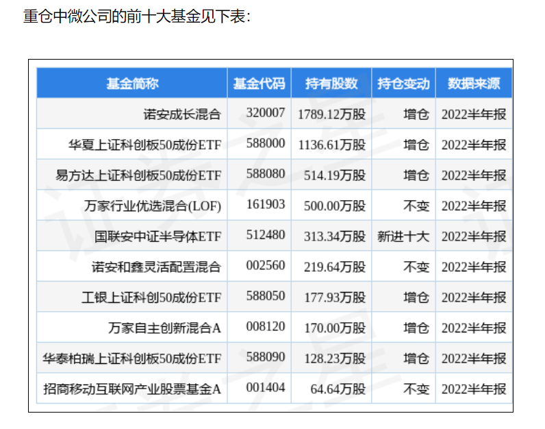 中微公司半年报显示,其前十大重仓股出现明显变化: