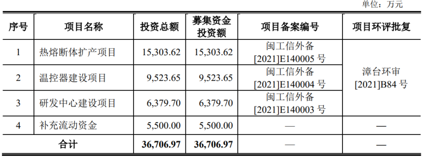 招股书显示,雅宝电子专注于热熔断体等电路保护元器件的研发、生产和销售,该公司产品单一,99%以上的营收来自于热熔断体产品。该公司此次IPO拟公开发行不超过2668万股,计划募资3.67亿元,其中有1.53亿元用于热熔断体扩产项目和0.95亿元就是用于温控器扩产项目,如下表。