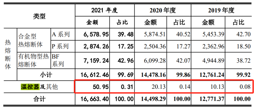 从上表不能发现,雅宝电子温控器收入占比非常低,其中2021年该公司温控器收入只有50.95万,占收入比只有0.31%。目前,该公司热熔断体产品是该公司的主要毛利贡献来源,毛利贡献率分别为100.05%、100.48%和100.78%;温控器等其他产品处于市场开发的初期阶段,尚未实现量产,因此报告期内公司主营业务中其他产品的毛利为负。
