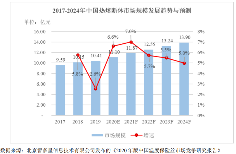 据悉,全球热熔断体市场是一个以销定产为主的成熟行业,市场总体保持供需平衡的态势。2019年,全球经济低迷,热熔断体主要市场如家用电器增长缓慢,但全球热熔断体的需求量依然保持缓慢增长态势。2019年全球热熔断体市场规模为15.78亿元,2024年全球热熔断体市场规模预计将达到21.49亿元,2019-2024年复合增长率约为6.4%。然而2019年,中国热熔断体市场规模为10.41亿元,占全球热熔断体市场规模的65.97%;预计2024年中国热熔断体市场规模将达到13.90亿元,占全球热熔断体市场规模的64.68%。