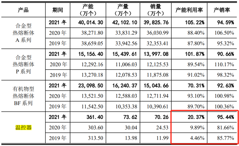 《电鳗财经》研究发现,该公司存在产品单一,热熔断体市场已经趋于成熟,并且该公司业绩增长乏力;另外,该公司温控器产能利用率明显不足,难符合创业板高成长的特性。