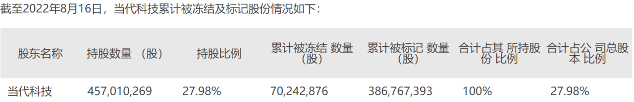 8月18日,人福医药发布公告,截至2022年8月16日,该公司的控股股东武汉当代科技产业集团股份有限公司(以下简称当代科技)持有公司4.57亿股,占该公司总股本的27.98%,其中已质押的3.87亿股已被司法标记,占其持有该公司股份数量的84.63%(需要冻结的数量为8630万股),剩余未质押的7024万股已被司法冻结及轮候冻结,占其持有该公司股份数量的15.37%。
