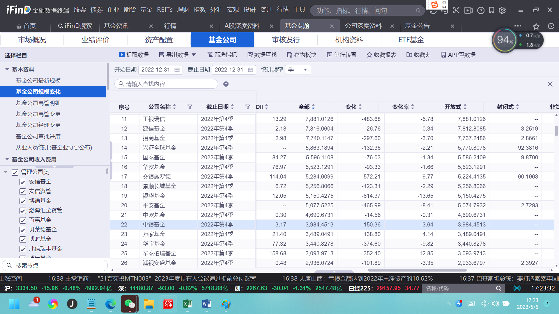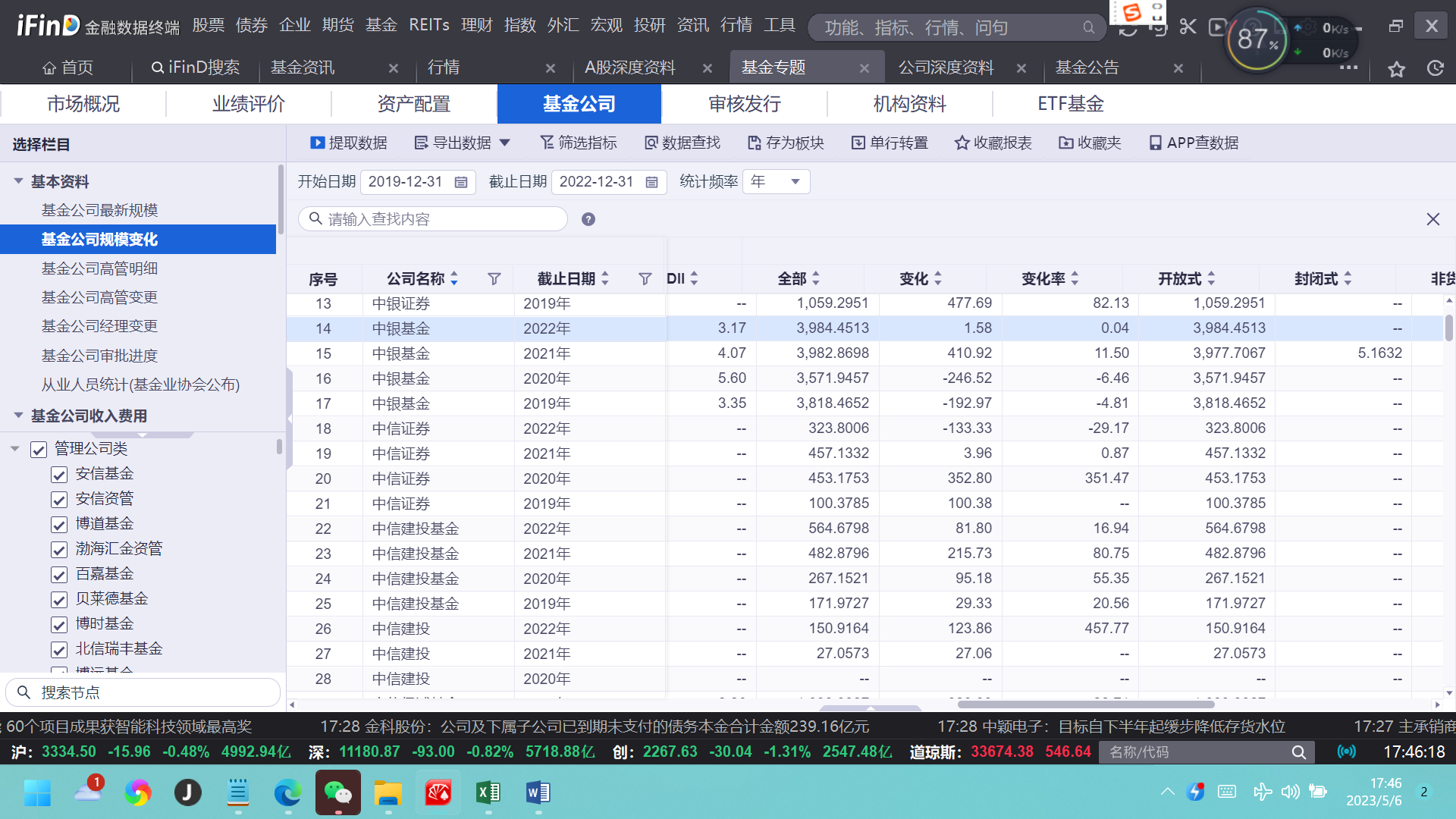 对比近几年的规模数据,中银基金在2019年、2020年出现规模快速下滑,净值规模同比分别下降192.97%、246.52%;2021年有所回升,但在2022年再度出现止步不前,规模维持在3980亿元。而在2018年年底,中银基金总资产净值规模达到4011亿元,也就是说,其后的4年时间不升反降,与全市场基金规模的增长走势相反。