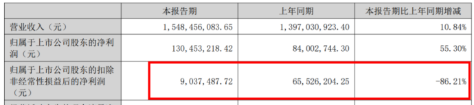 2022年上半年,该公司实现营收15.48亿元,较上年同期增长10.84%;而该公司扣非后净利润为903.75万元,同比下降86.21%。