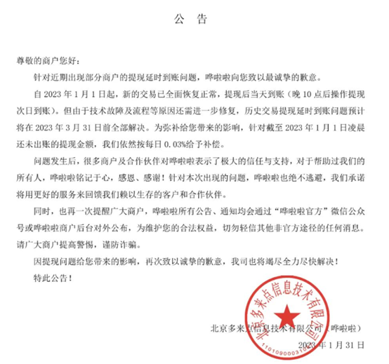 为弥补延时到账给商户的影响,哗啦啦在公告中称,针对截至2023年1月1日凌晨还未出账的提现金额,按每日0.03%给予补偿。