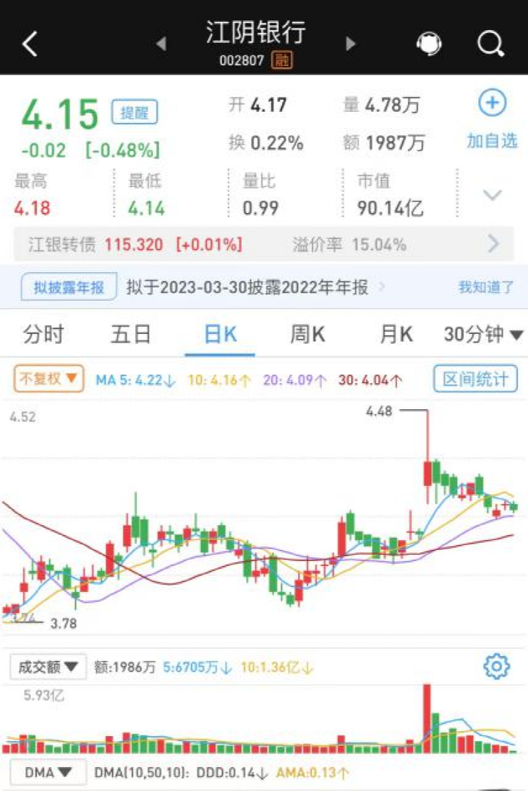 从近几日股价表现来看,江阴银行暂未出现明显大涨。截至2月7日晚,江阴银行小幅微涨,当日收盘价为4.17元/股,上涨0.48%;同时,2月8日早盘,股价为4.16元/股,微跌0.24%。