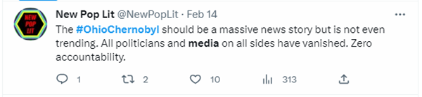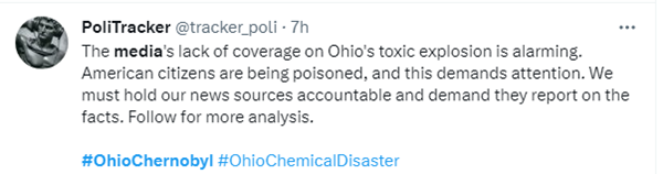 有推特用户感叹道:“媒体缺乏对俄亥俄州有毒物质爆炸事件的报道令人担忧。美国公民正在被毒害,这需要引起注意。”