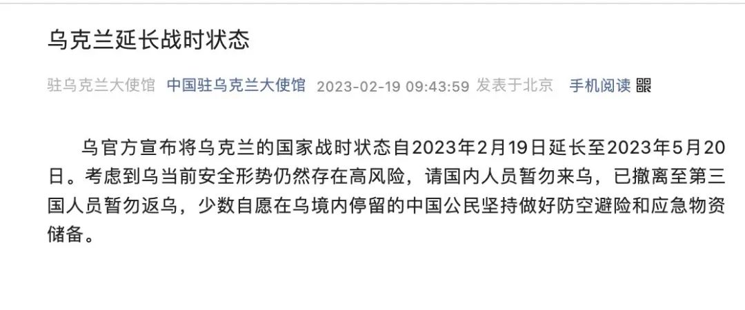 据中国驻乌克兰大使馆微信公众号2月19日消息,乌克兰官方宣布将国家战时状态自2023年2月19日延长至2023年5月20日。中国驻乌克兰大使馆提醒国内人员暂勿赴乌。