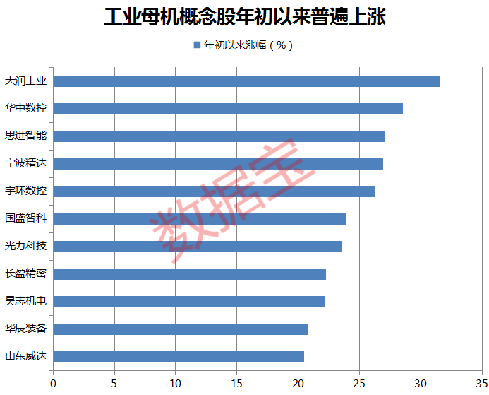 证券时报·数据宝统计,工业母机产业链概念股共27只,今年以来工业母机板块获得资金青睐,概念股普遍大幅上涨,四成个股累计涨幅超20%,天润工业、华中数控、思进智能累计涨幅居前,分别为31.59%、28.57%、27.09%。