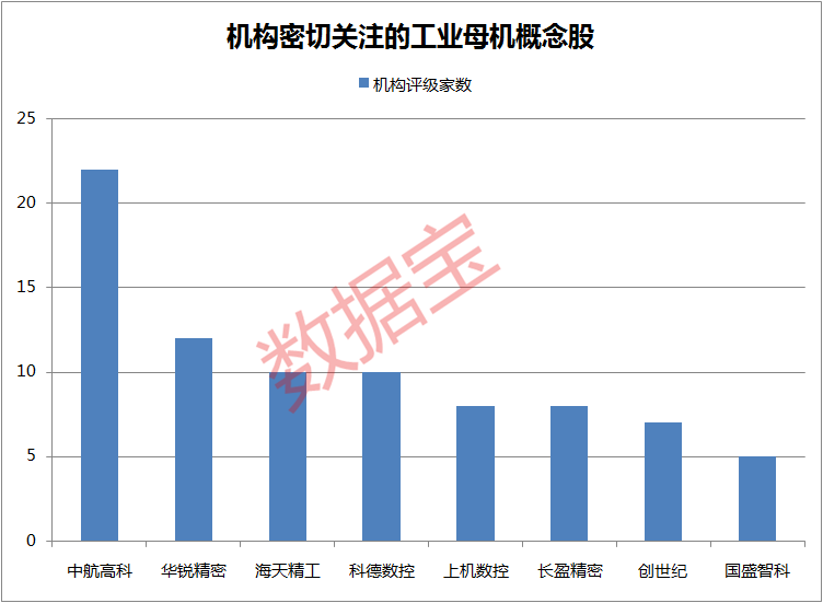近三成工业母机个股获机构密切关注,评级机构家数超过5家,中航高科、华锐精密、海天精工评级家数居前,分别有22家、12家、10家。