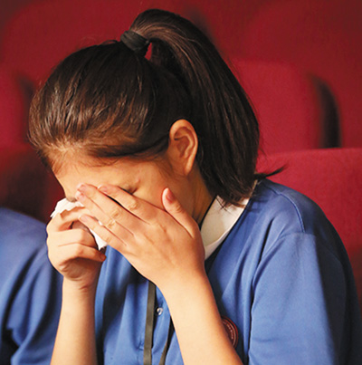 闭上眼睛,头微微向上抬起,马德丽认认真真倾听解说词,舍不得漏掉一字一句。遇到惊险刺激的情节,她紧张地抓住座椅扶手。身旁的同伴唐发米、王惠容,同样“看”得入神。